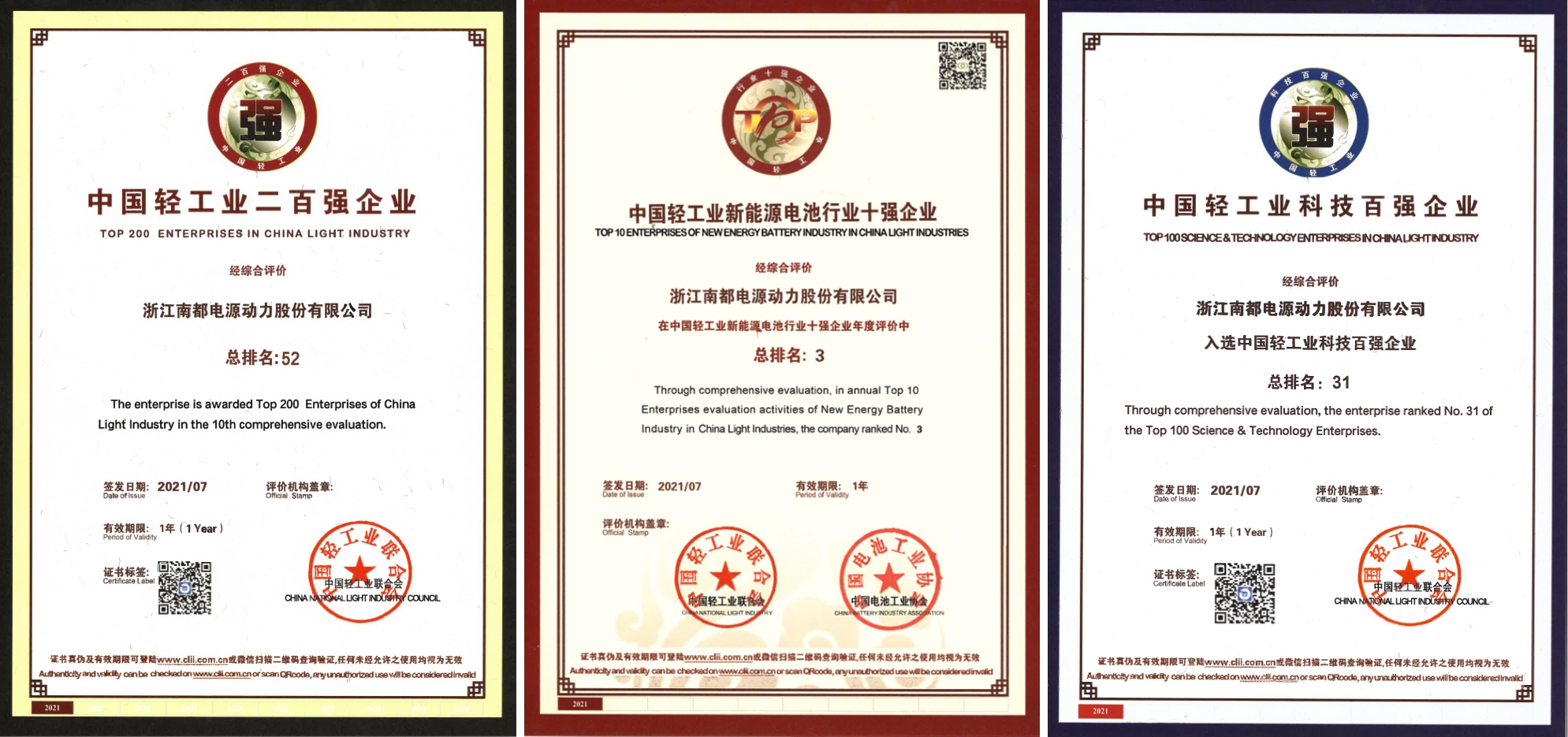 日前,,,,,中国轻工业团结会宣布了 2020 年度中国轻工业二百强企业榜单,,,,,CQ9·电子官方网站再次入选,,,,,位列第 52 位,,,,,同时公司还荣获了中国轻工业科技百强榜第 31 位和中国轻工业新能源电池行业十强榜第 3 位。。。。。。。。这也是“中国轻工业百强企业”自 2011 年宣布以来,,,,,CQ9·电子官方网站一连十年上榜。。。。。。。。